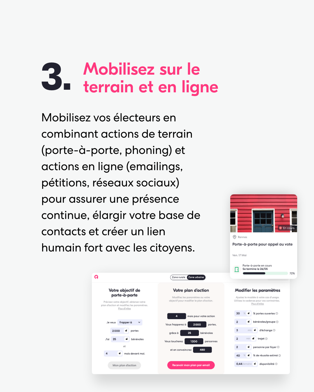 Donnez à vos militants les moyens d’agir facilement, où qu’ils soient. Avec l’application mobile, ils mènent des porte-à-portes, des appels, et diffusent vos messages et pétitions.