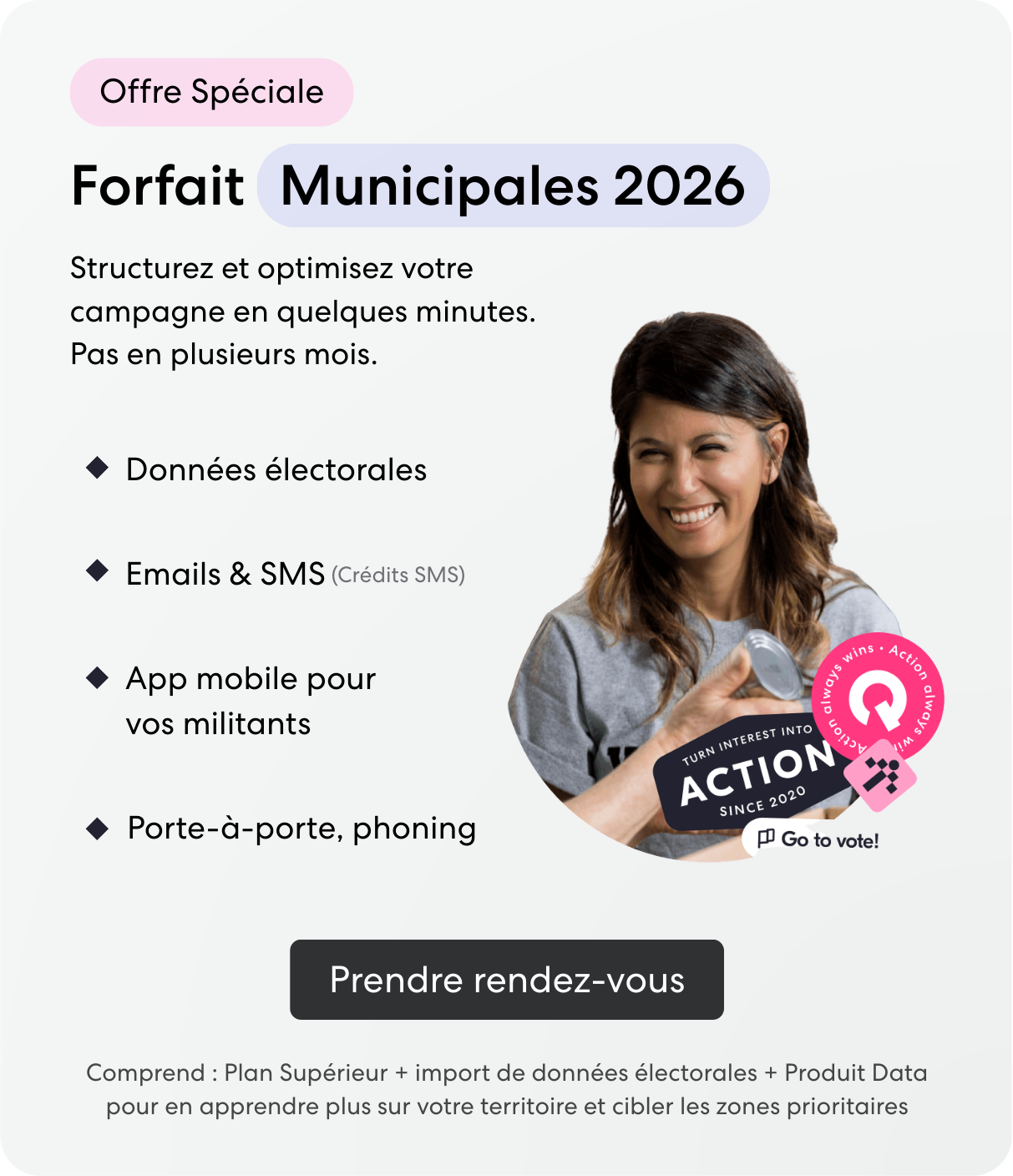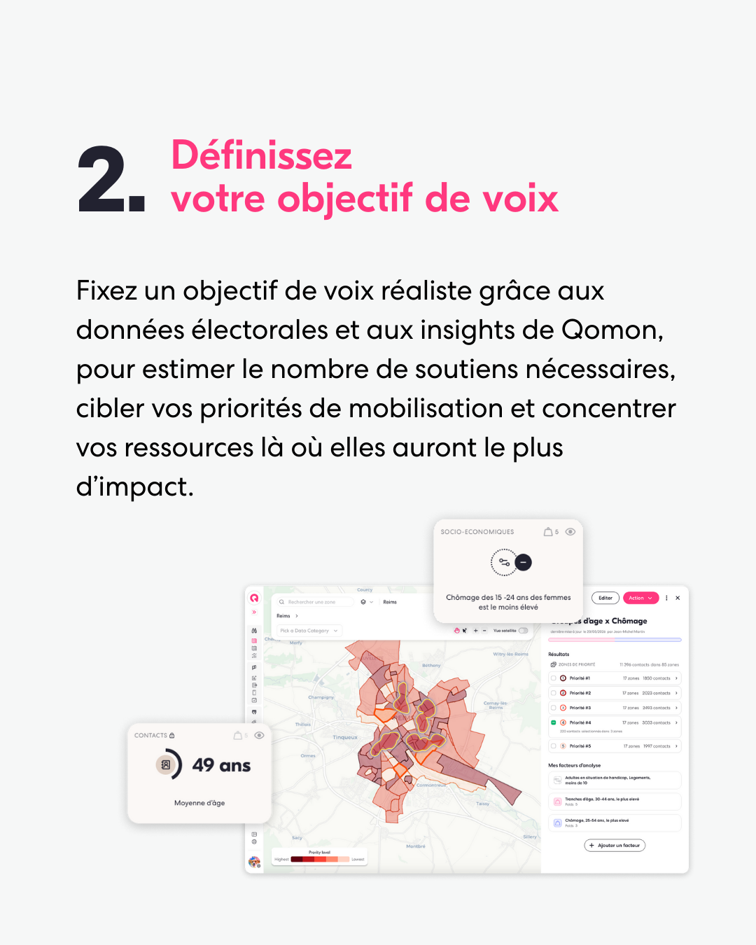 Ne perdez plus de temps là où ça ne fonctionne pas : identifiez enfin les bureaux de vote où vos actions auront le plus d’impact grâce à plus d'1,5 milliard de points de données territorialisées (tendances de vote, revenus…) et à une vue cartographique interactive.