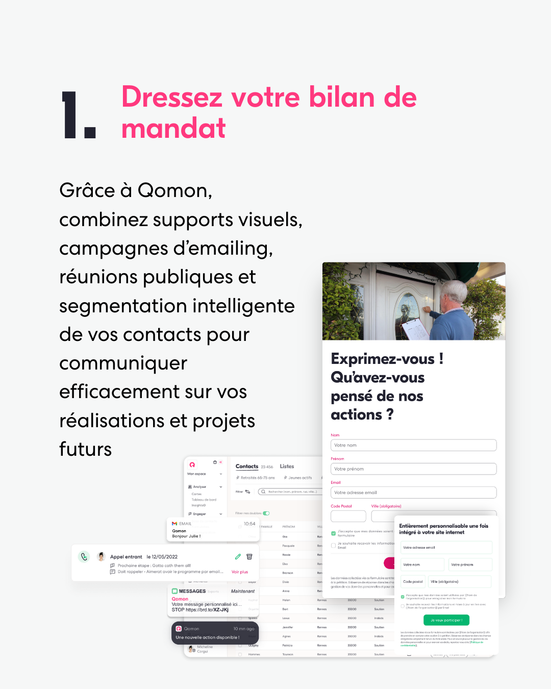 Centralisez vos soutiens, électeurs et militants au même endroit. Envoyez des communications ciblées par emails ou SMS. Créez des parcours automatiques pour ne laisser aucune interaction sans réponse.